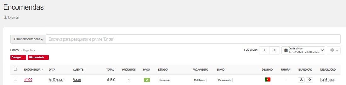 No menu Encomendas pode aceder a listagem com todas as encomendas registadas na loja nos últimos 12 meses. Tem também disponível a coluna Devolução onde pode verificar as encomendas com pedidos de devolução.
