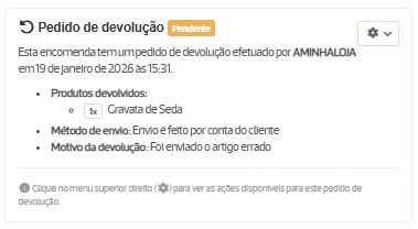 Na área de gestão da sua loja online, na página de detalhes de uma encomenda (menu Encomendas) pode consultar toda a informação sobre o pedido de devolução solicitado, assim como a guia gerada, caso já a tenha criado.