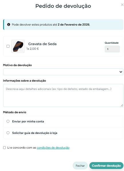 Ao selecionar esta opção, a encomenda fica com um pedido de devolução associado e o cliente é responsável por efetuar o envio do(s) objeto(s) que pretende devolver, bem como suportar os custos de envio do(s) mesmo(s).