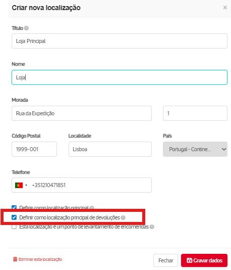 É a morada onde pretende receber a encomenda devolvida. Pode escolher uma localização de entre as criadas no menu Configurações / Envio / Localizações. É necessário ter pelo menos uma localização configurada para ser possível avançar com o processo de devolução. Nas localizações criadas, pode optar por definir uma localização principal de devoluções que fica selecionada por defeito quando cria a devolução.
