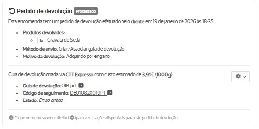 Se o cliente iniciar o pedido, pode selecionar suportar os custos da devolução da encomenda ou solicitar a guia de devolução, caso tenha esta opção ativa no menu Configurações / Encomendas. Se pedir a guia de devolução, posteriormente, na ficha da respetiva encomenda na roda dentada (⚙️) tem a opção de Criar guia de devolução. Ao criar/associar a guia, o cliente pode obter a mesma na área de cliente na loja ou através do email com a atualização do estado de encomenda.
