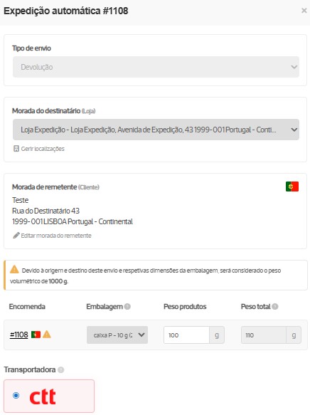 A partir dos detalhes da encomenda tem disponível o botão Editar morada de envio, na secção Envio, que permite alterar os dados de envio antes de criar a guia de devolução da encomenda. Ao editar a morada do remetente, será essa a morada que fica associada ao cliente final na encomenda.